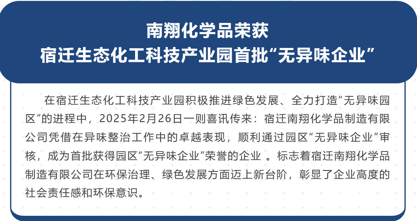 此次荣获园区“无异味企业”的称号,是对公司长期以来坚持绿色发展的充分肯定, 也将激励企业继续践行环保责任,为建设美丽园区贡献力量。宿迁南翔化学品制造有限公司将以此为契机,不断提升环保管理水平,持续改进生产工艺,努力打造资源节约型、环境友好型企业,为实现高质量,可持续发展目标而不懈奋斗!