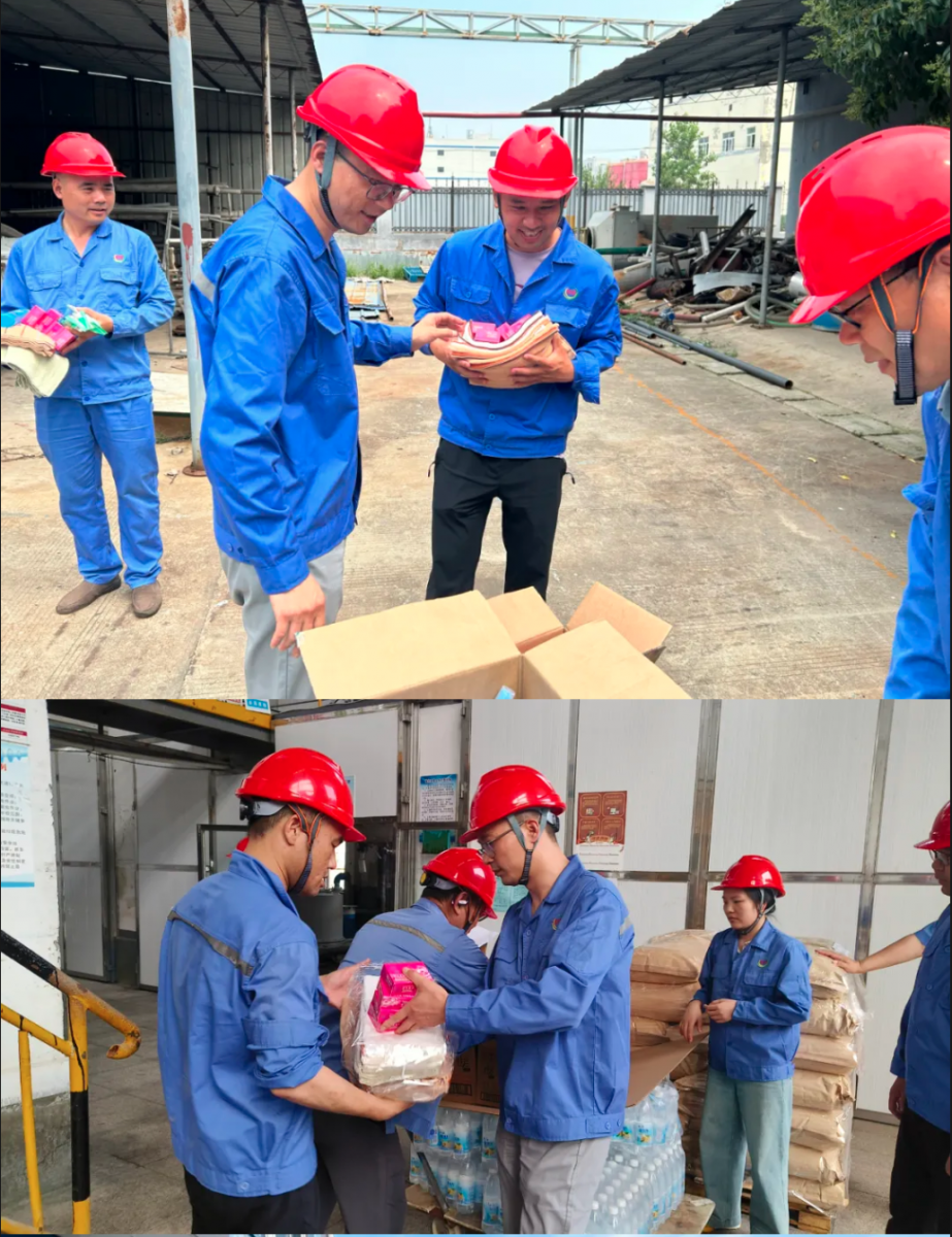 7月7日,由公司总经理宋津杰、党支部副书记陆萍、工会主席密龙风带队,生产副总侍军华及相关部门负责人共同组成的高温慰问小组,深入一线,将一份份饱含关怀的"清凉"礼包与诚挚问候,送到了奋战在高温岗位的员工手中。